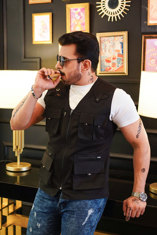 Premium Cotton Fleece Four Pocket sleeveless Jacket Black Jkt-01