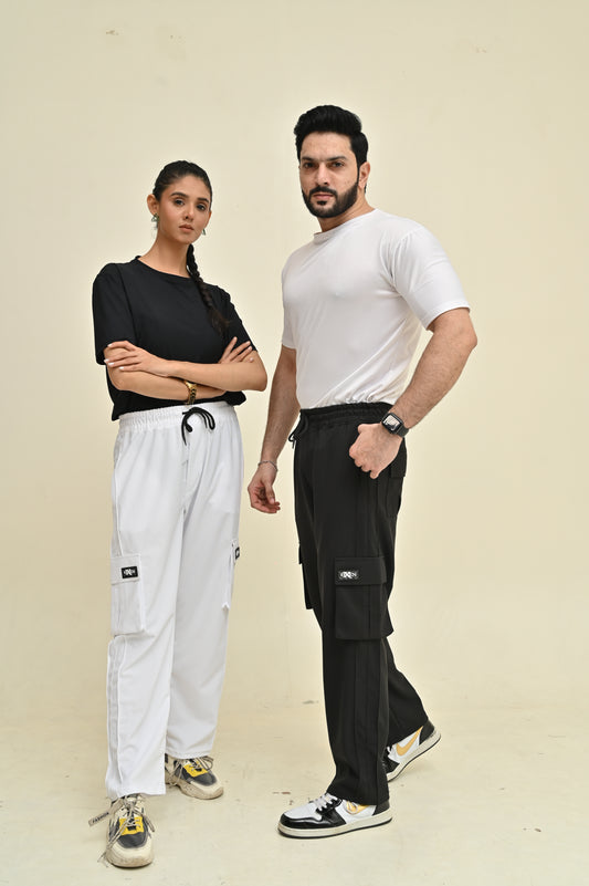 Premium Black Three Tapes Men's 4 way Stretch-able Lycra Oval Pocket Cargo Trousers